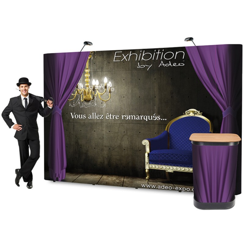 LE STAND PARAPLUIE DROIT 3X4 : Incontournable pour meubler vos expositions et attirer vos prospects. Il se compose, d’une structure en aluminium anodisé avec verrouillage magnétique et suspentes avec crochets non visibles, un trolley de transport et deux spots halogènes 150 watt.